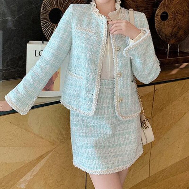 Brownm Runway 2021 Autumn Winter 2 Piece Set Elegant Plaid Tweed New Temperament Beading Jacket coat + tassel MIni Skirt Suit