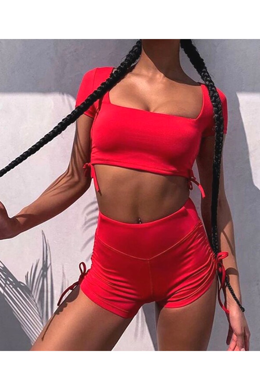 2 Layers Elastic Crop Top Set And Drawstring Shorts Bacless Hollow Sexy 2 Pieces Set Women Home Clothes Tracksuit Outfit 1004-1