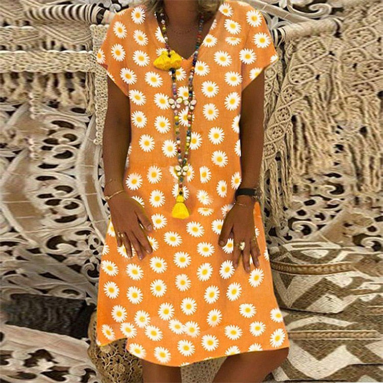 2020 Summer Floral Summer Loose Dress Women V-neck Short Sleeve Plus Size Elegant Midi Dresses Beach Casual Boho Yellow Dress