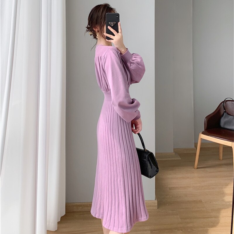 2021 New Autumn Winter Women Lantern Sleeve Sweater Dress Ladies Casual A-Line Midi Knitted Dresses Vestidos
