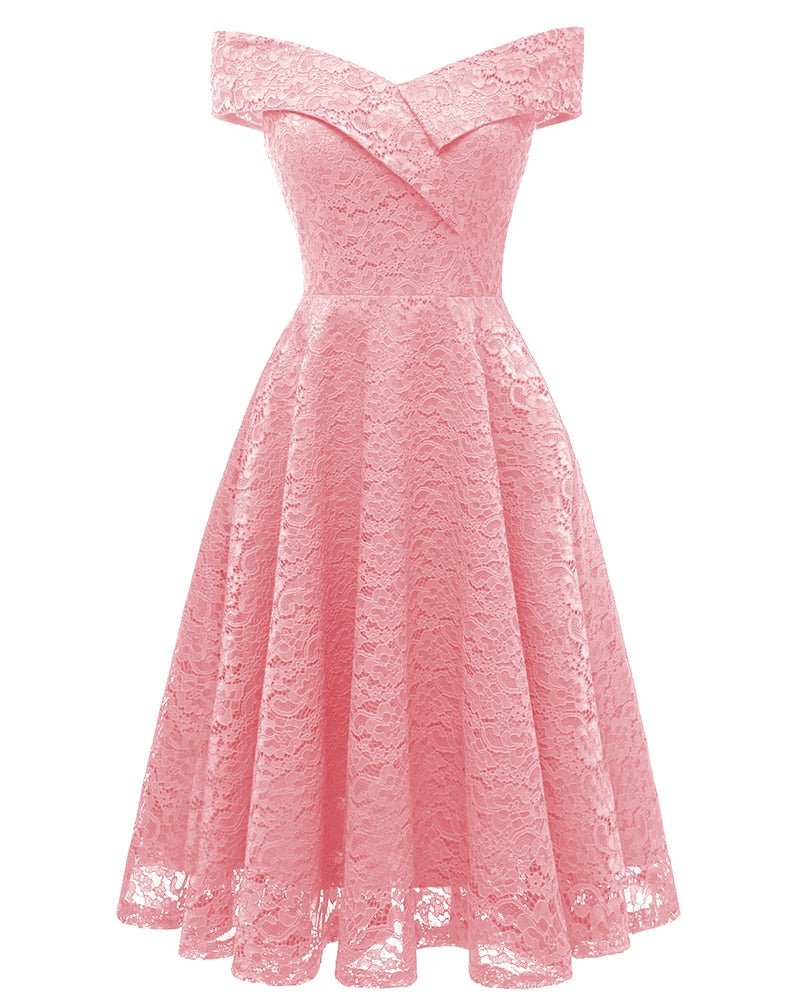 2021 New Vintage Lace Evening Party Dress Women Slash Neck Sleeveless Midi Dress Ladies Elegant Pink Dresses Vestido De Festa