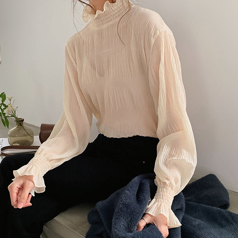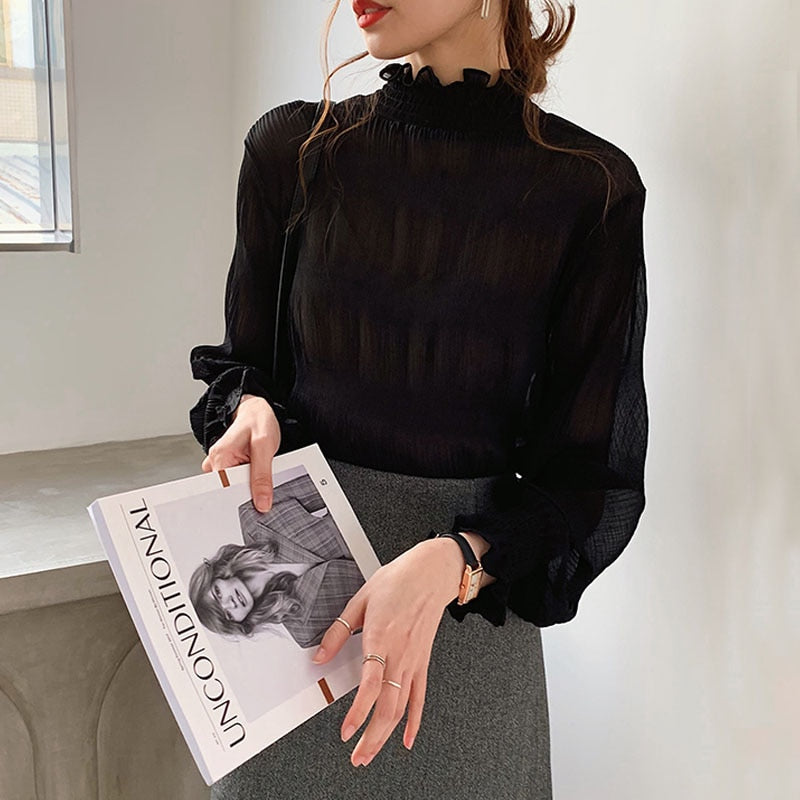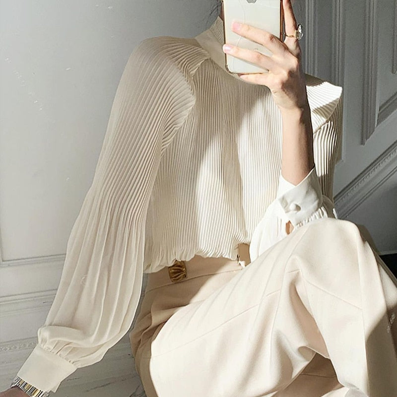 2021 Spring New Pleated Women Shirts Fashion Office Lady Chiffon Blouse Women Stand Collar Flare Sleeve Solid Female Tops 9542
