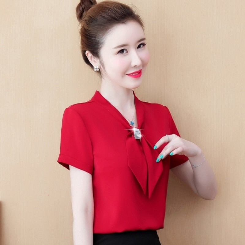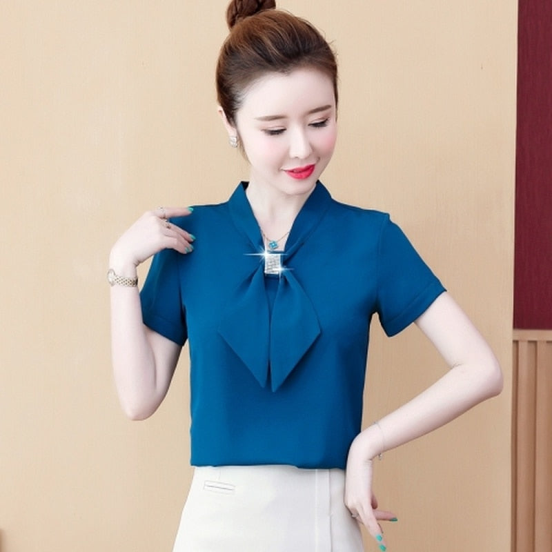 2021 Summer Bow Loose Solid Women Blouses and Tops Solid Bottom Shirts Elegant Fashion Short Sleeve Chiffon Women Shirts 9529