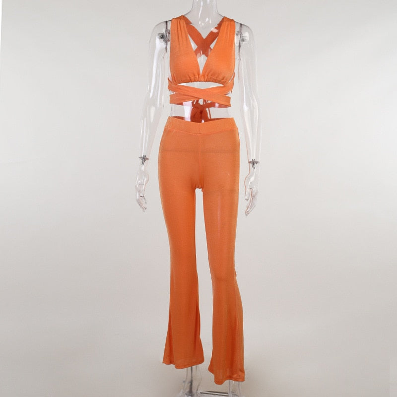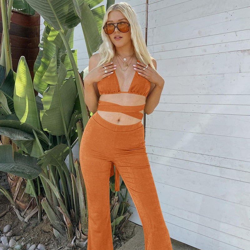 2022 Green Romper Sexy Bandage Backless Top and Pant Sets Sleeveless Solid Women's Sets Fashion Outfits Matching Set Flare Pants