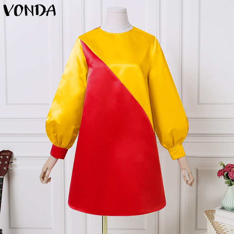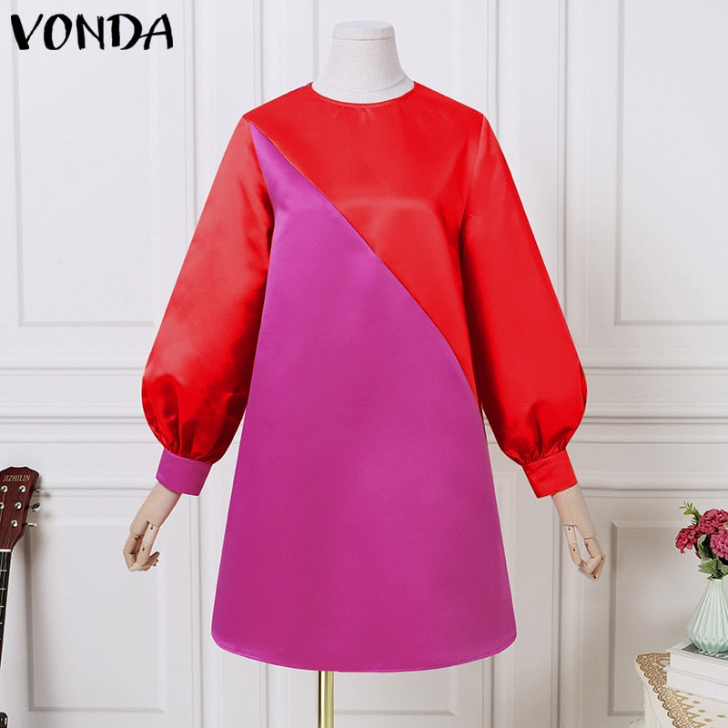 2022 Summer Dress VONDA Women Casual O Neck Vintage Patchwork Long Lantern Sleeve Dresses Plus Size Party Vestidos Short Robe