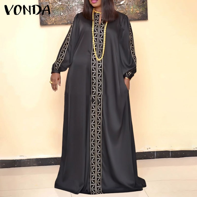 2022 VONDA Long Sleeve Vintage Printed Party Maxi Dress Women Summer Vestidos Casual Sexy V Neck A-Line Satin Oversized Sundress
