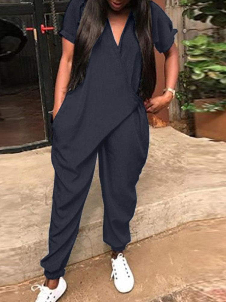 2022 ZANZEA Fashion Summer Rompers Women Solid V Neck Long Jumpsuits Casual Loose Short Sleeve Overalls Harem Pants Playsuits