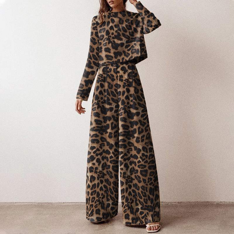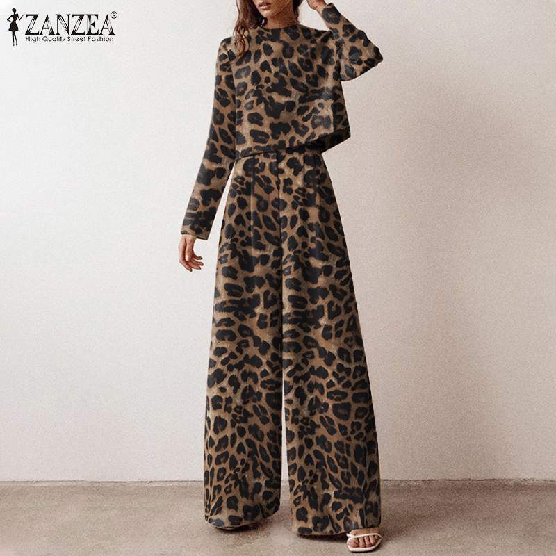 2PC Fashion Leopard Printed Sets ZANZEA Women's Autumn Long Sleeve Matching Sets Casual Loose Urban Tracksuit Wide Leg Pant Sets