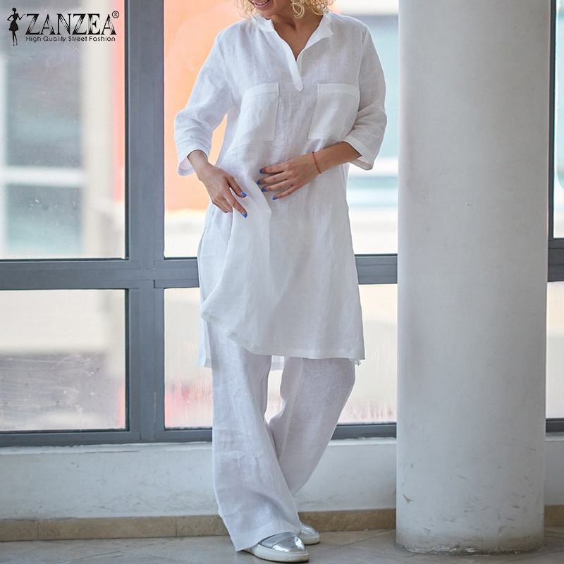 2PCS Autumn Matching Sets Women Fashion Solid 3/4 Sleeve Blouse Casual Loose Wide Leg Trousers Cotton Pant Sets Oversize Suits