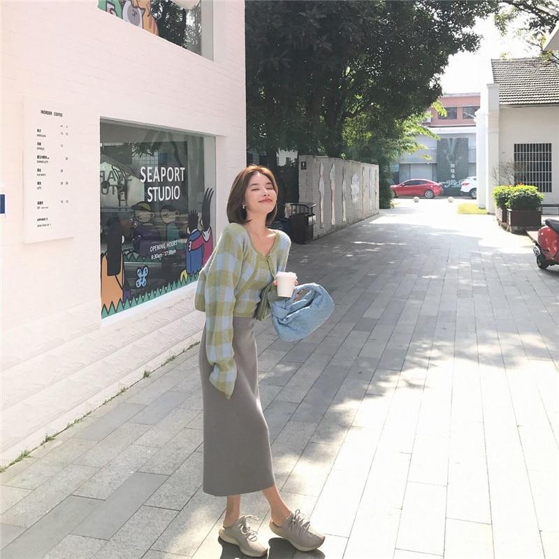 (2Pcs/set ) Korean Fashion Plaid Knitted Cardigan + Checkered Vest Two-piece Set Blusa De Frio Feminina Sueters De Mujer 1125