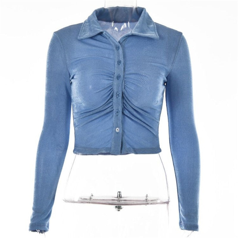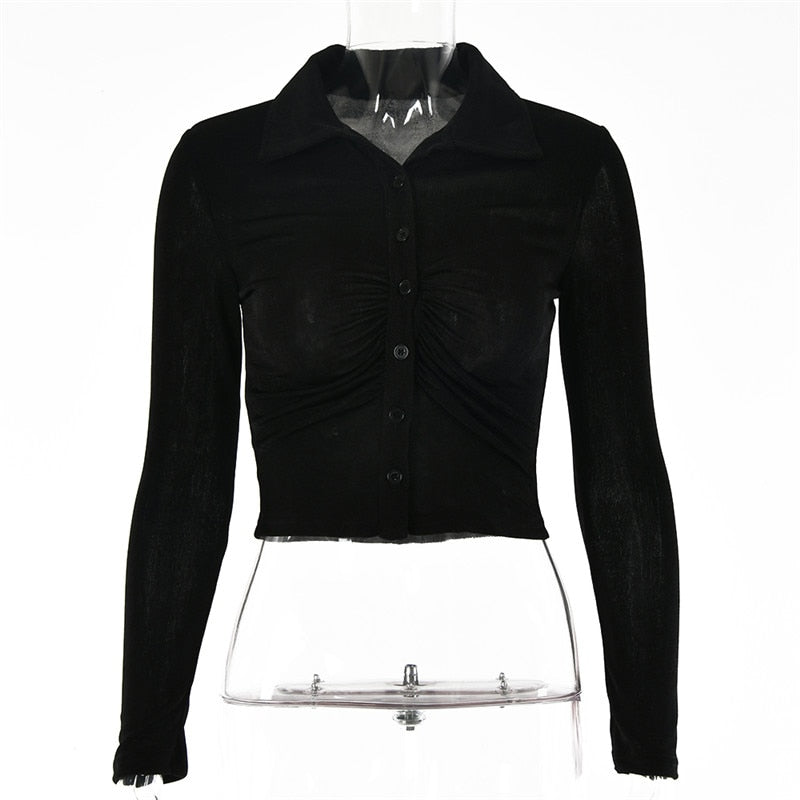 Articat Autumn Long Sleeve Buttons Ruched T-Shirts Women Sexy Turn-Down Collar Slim Crop Tops Femme Fashion High Street T Shirt
