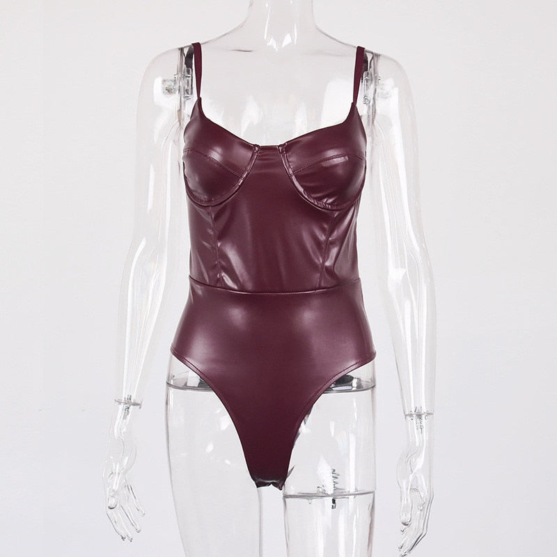 Articat Sexy PU Leather Skinny Bodysuit Women Solid Sleeveless Spaghetti Strap Women Jumpsuits Sexy Night Party Club Overalls