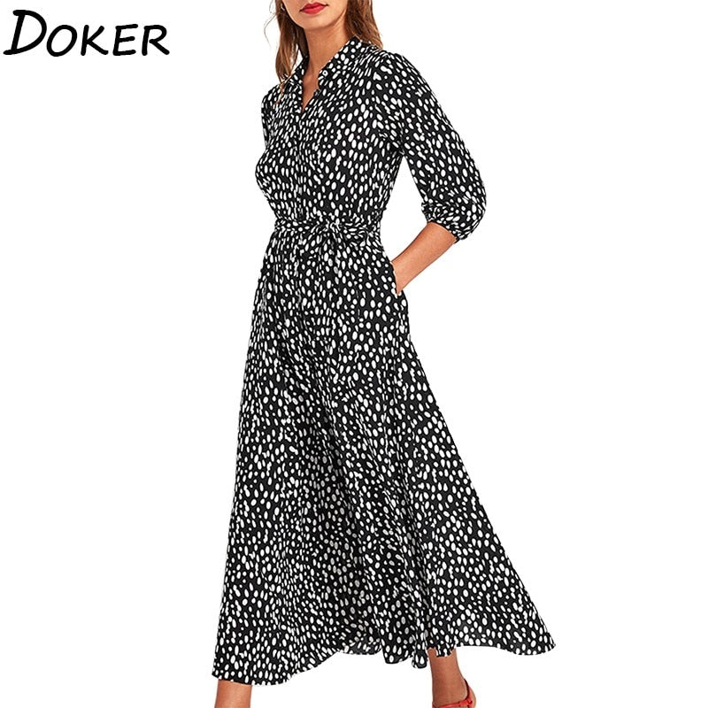 Autumn Polka Dot Chiffon Dress Women Turn-down Collar 3/4 Sleeve Belt  Elegant Ladies Midi Dresses Boho Casual Long Shirt Dress