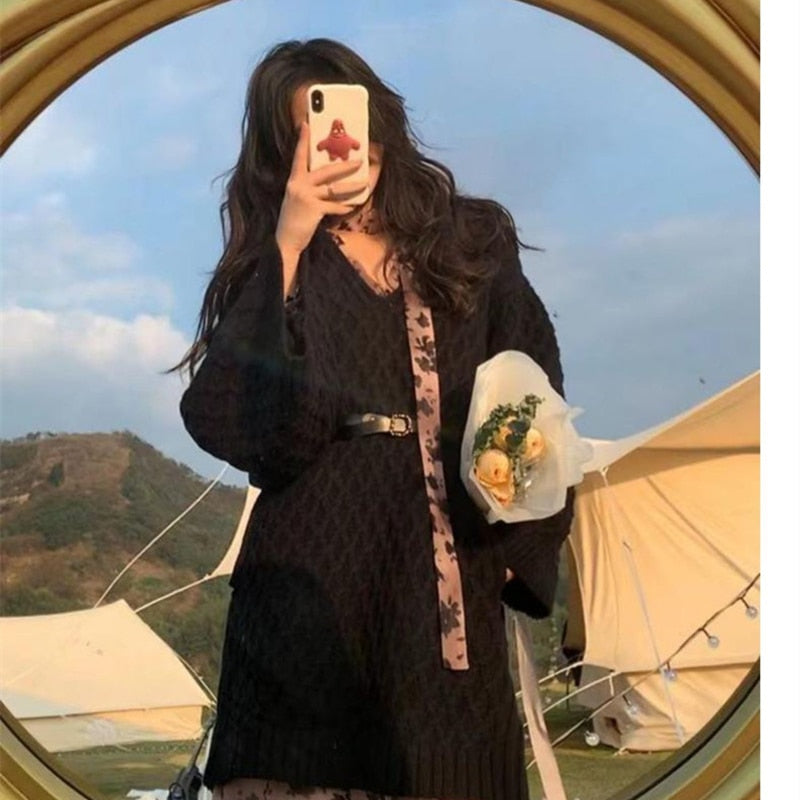 Autumn Winter Women Long Sleeve Sweater Dress V-neck Pullovers Loose Korean Thick Warm Casual Vintage Knitted Oversize Knitwear