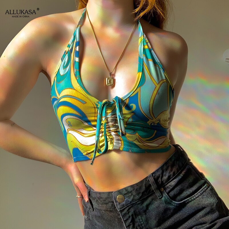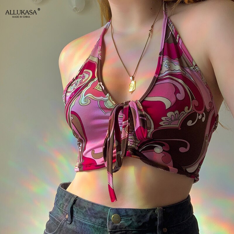 Beach Holiday Top 90s Vests Paisley Printed Crop tank Top y2k Aesthetic Halter Top Ruched Tie Up Camis Women Vintage Sweats