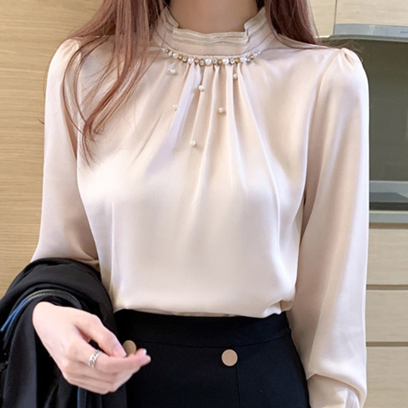 Blouses Long Sleeve Blouse Women Blusas Mujer De Moda 2021 Beading Stand Collar Chiffon Blouse Shirt Women Tops Blusas D537