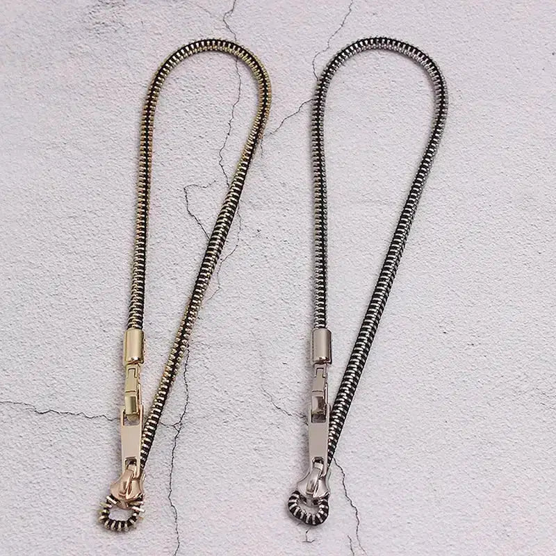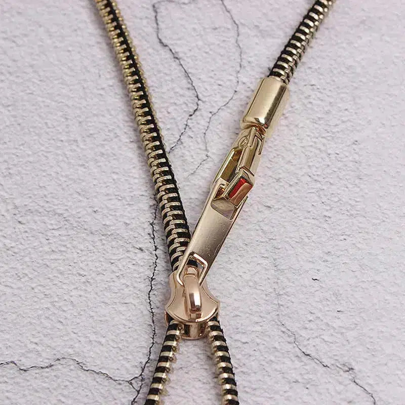 Make a bold statement with this zipper necklace. Its unique design features a functional zipper, adding an edgy and industrial touch to your look. Perfect for adding a distinctive flair to any outfit, this necklace is a conversation starter and a stylish accessory.