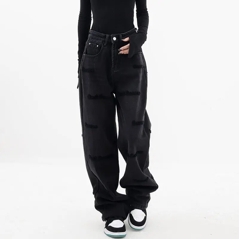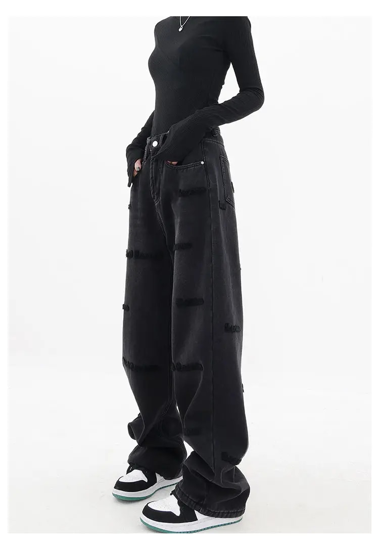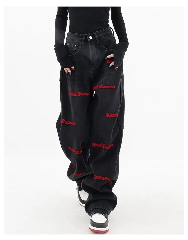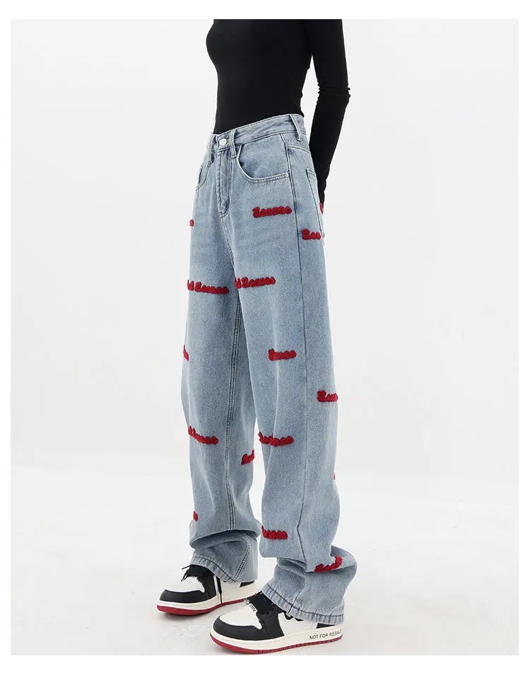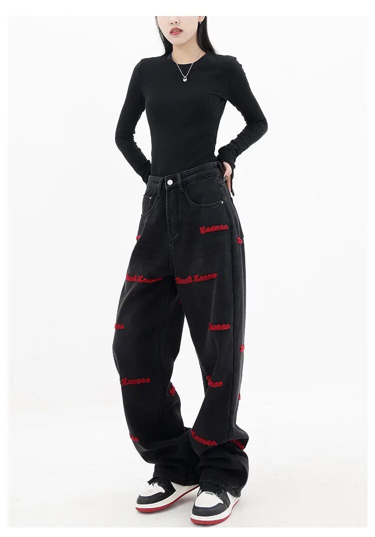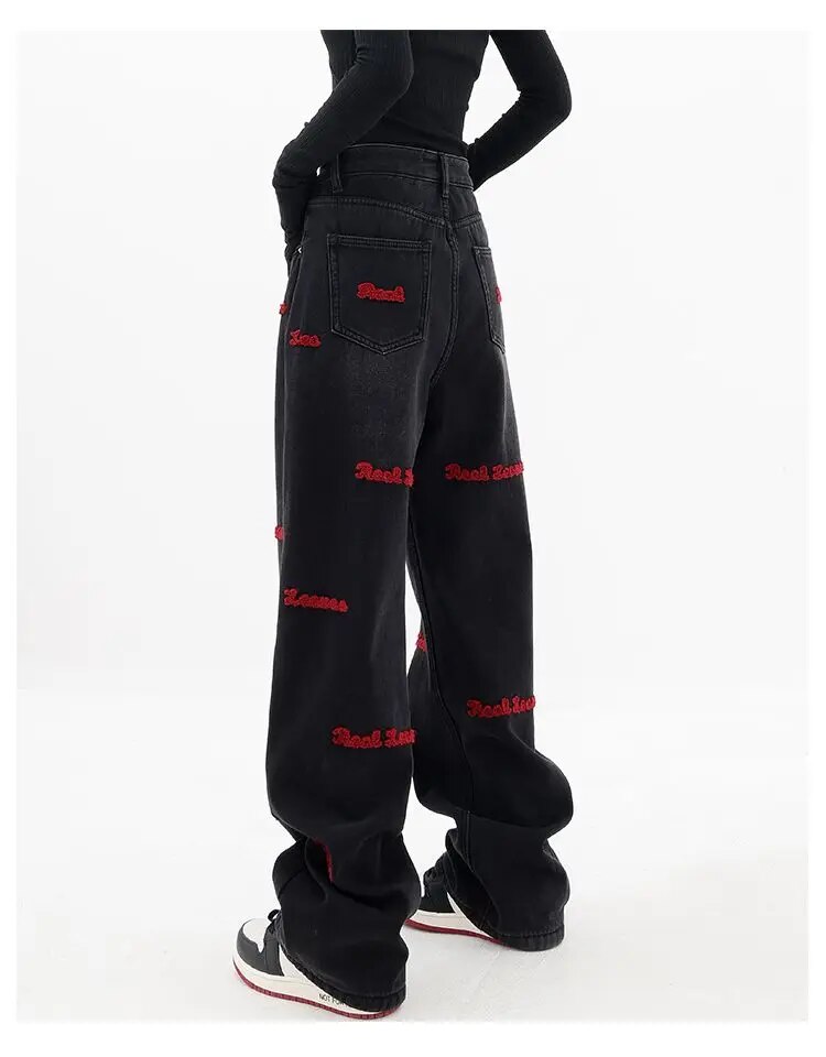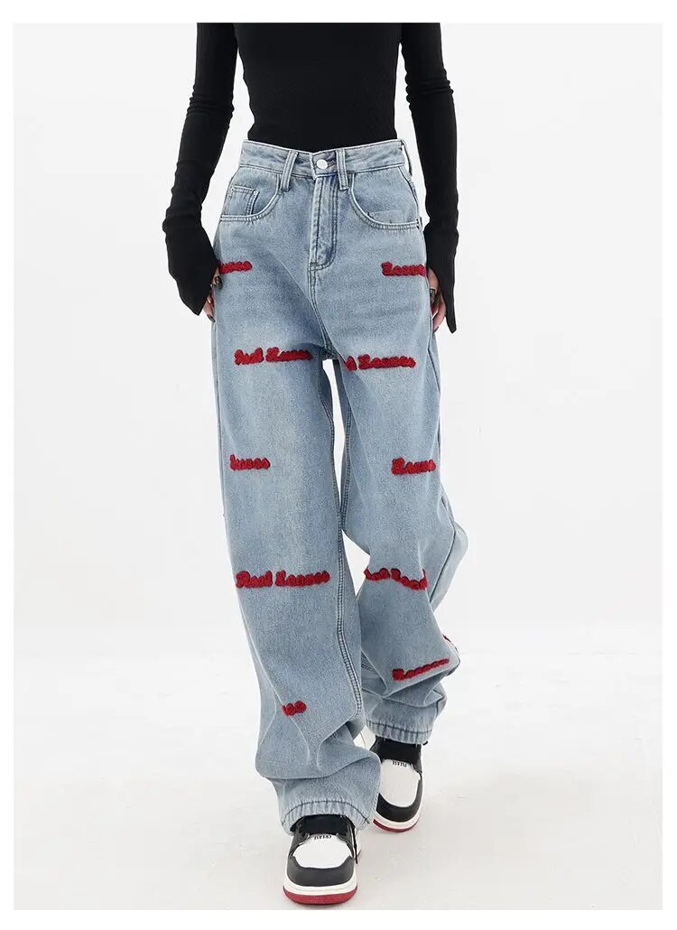Brownm and autumn plus size women embroidered straight jeans loose slim high waist floor mopping wide leg pants baggy jeans