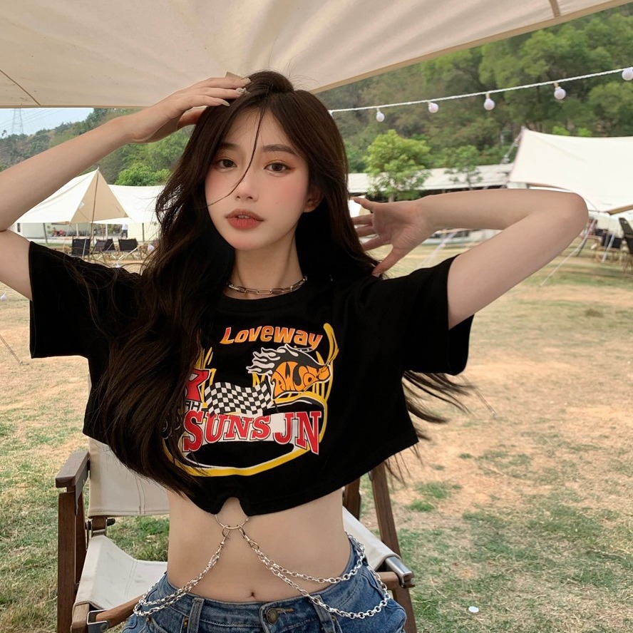 Brownm Brownm 2024 New Hottie Everything Ins Trendy T-Shirt Women's Design Sense Chain Short Crop Black Short-Sleeved Top