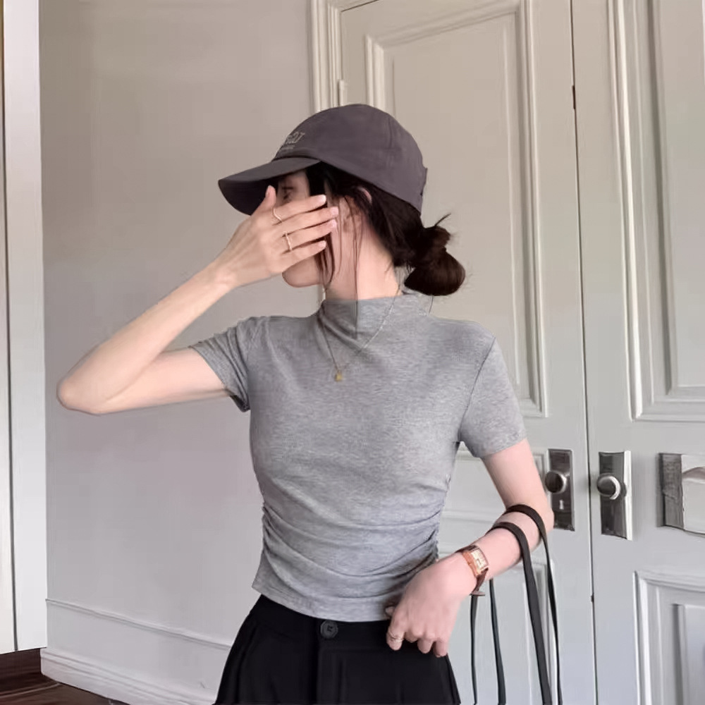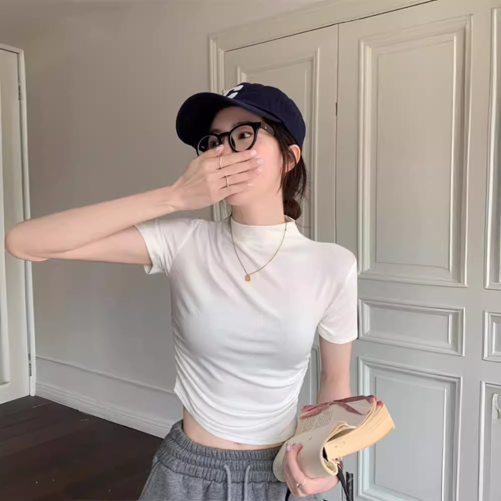 Brownm Brownm Collar Short-Sleeved T-Shirt Women's Summer 2024 New Bottom Shirt With Slim Short Student Pleated Top