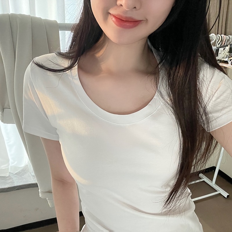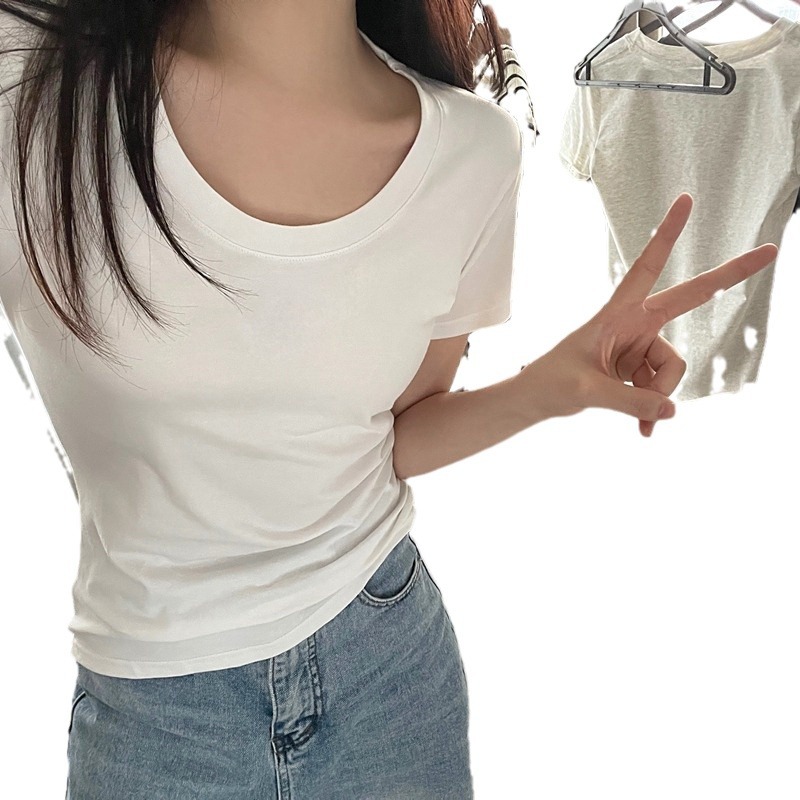 Brownm Brownm U Collar Short T-Shirt Female 2024 Summer New Slim Hot Girl With Waist Half Sleeve Shirt Bottom Small Top