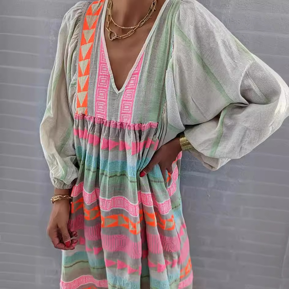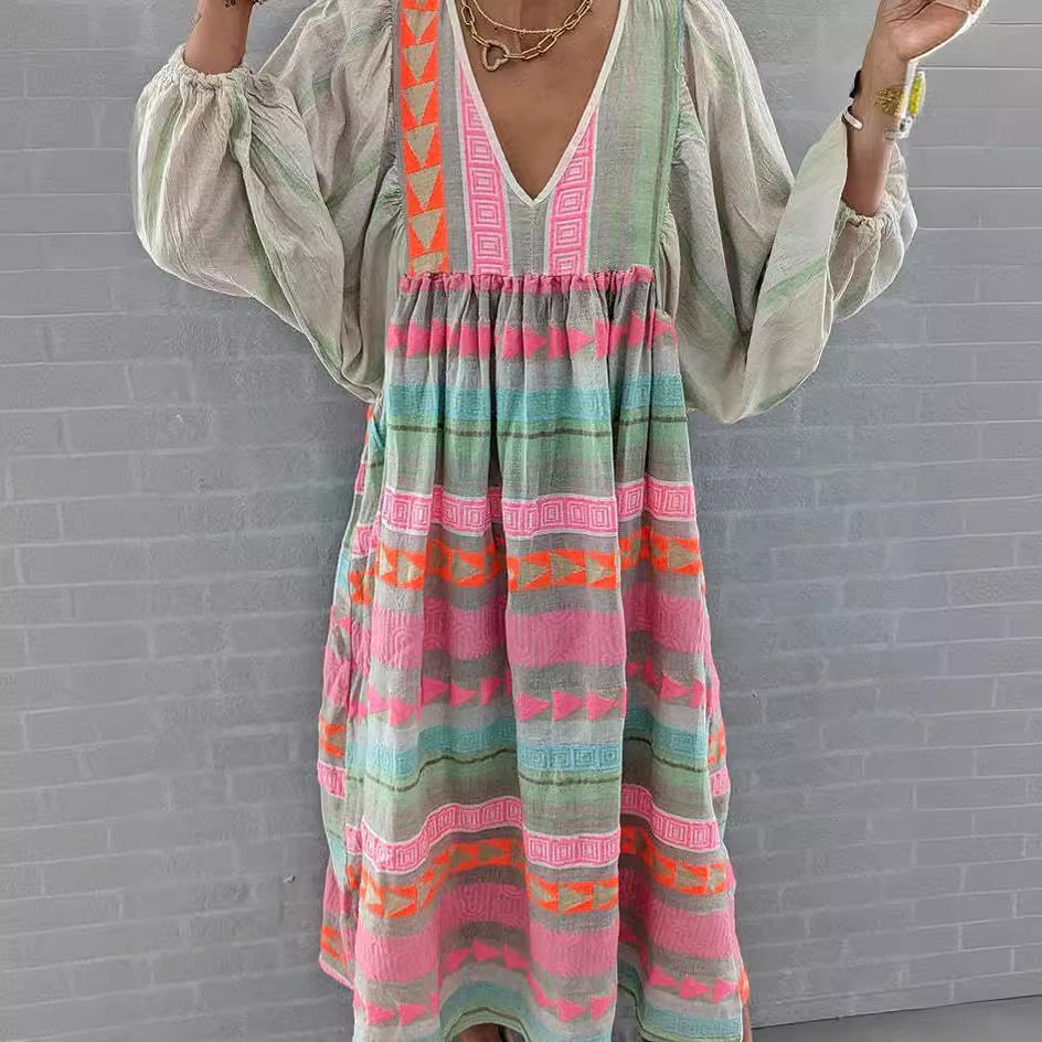 Brownm Brownm Women's New Fashion Sleeve Deep V-Neck Loose Large Size Bubble Sleeve Color Folds Casual Dress Women