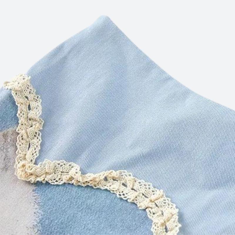 Wrap your hips in playful charm with this light blue mini skirt featuring a sweet kitten framed in a heart-shaped lace trim. It's a whimsical piece that perfectly embodies a soft-girl aesthetic, blending youthful prints with classic lace for a touch of nostalgia. Ideal for adding a quirky twist to your ensemble.
