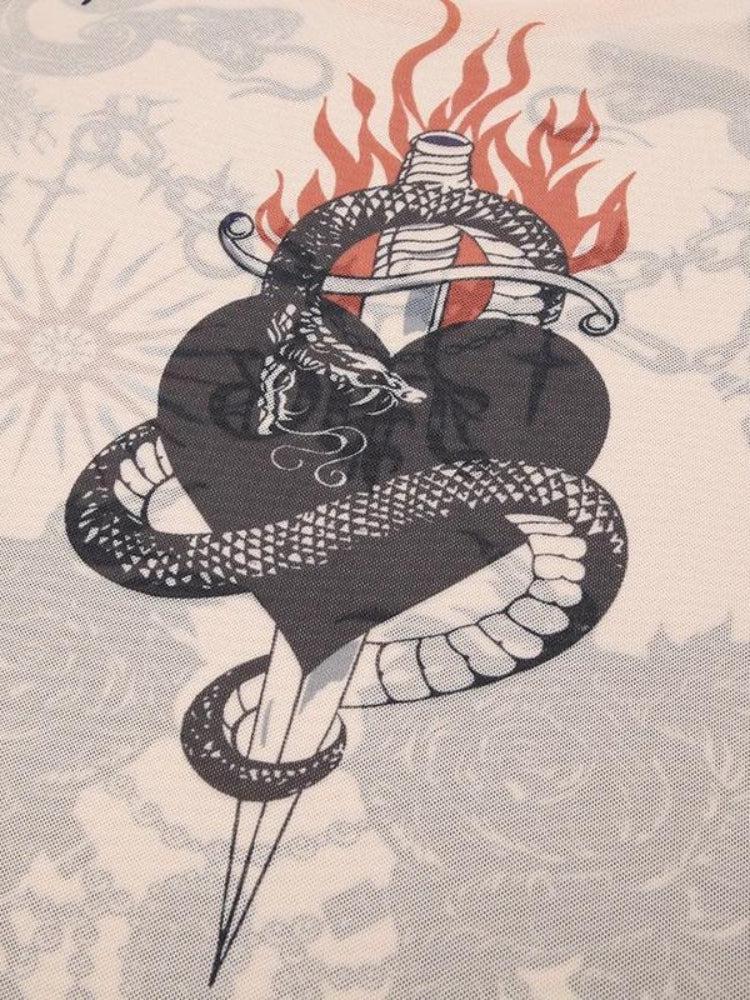 • Tattoo print details: heart, snake, stripes, sun, sword, barbed chain, flame, roses, stones, flowers, lightning, leaf, jewelry