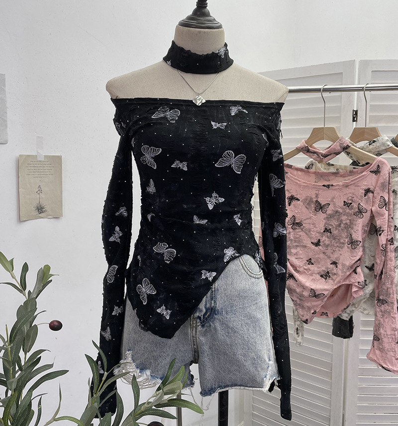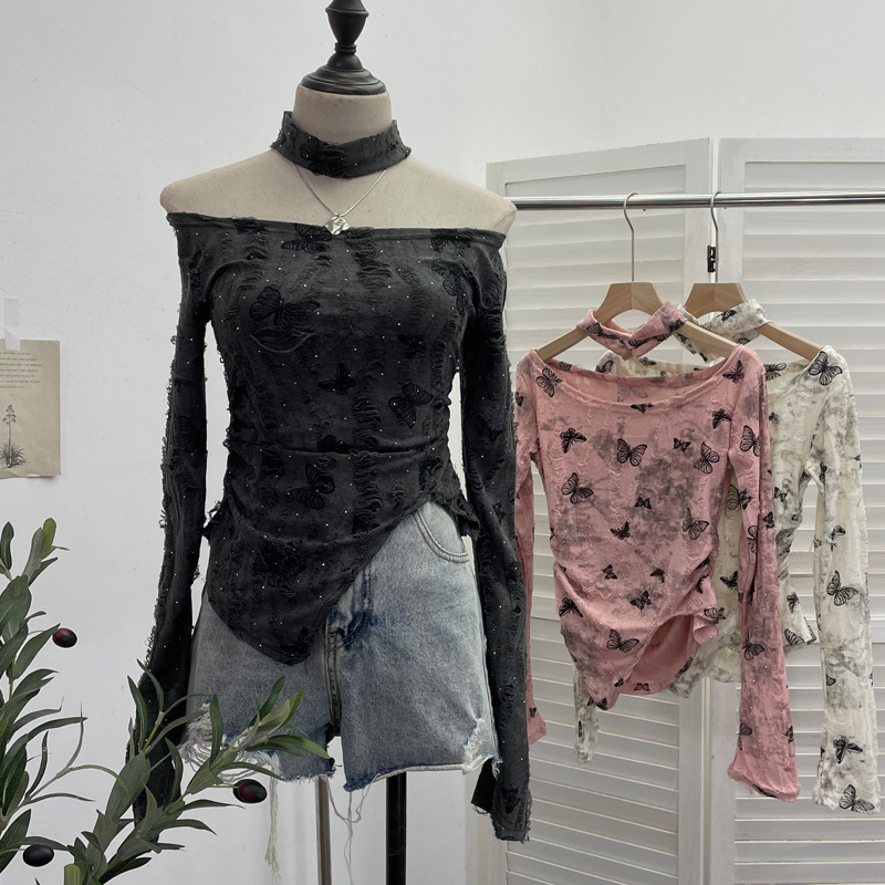 Brownm Pink Butterfly Hanging Neck To Make Old Hole Long-Sleeved T-Shirt Hottie Slanted Shoulder Slim Short Blouse 8002