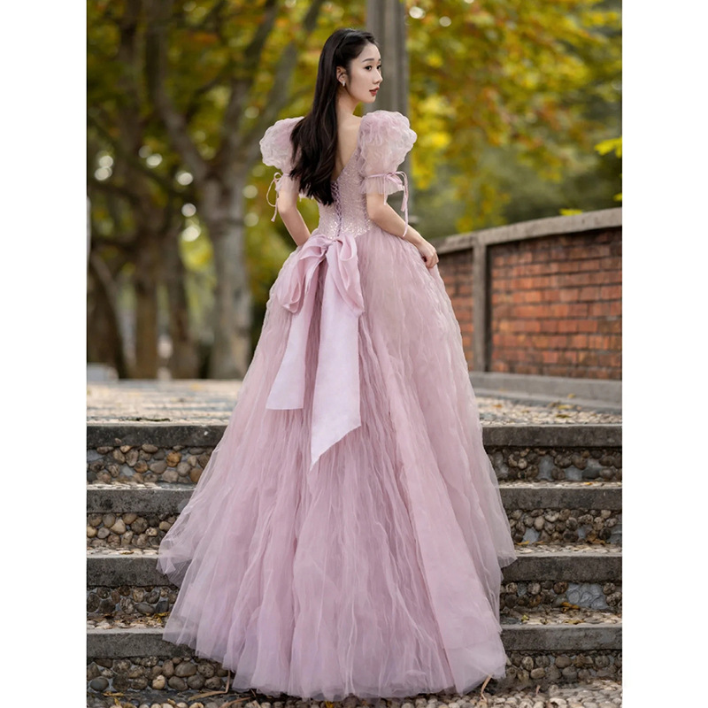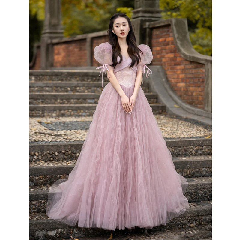 Brownm Pink Evening Dress Women's 2025 New Light Luxury Small Adult Lisson Princess Dress Bubble Sleeves