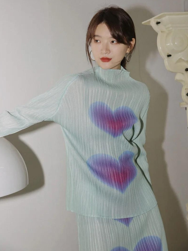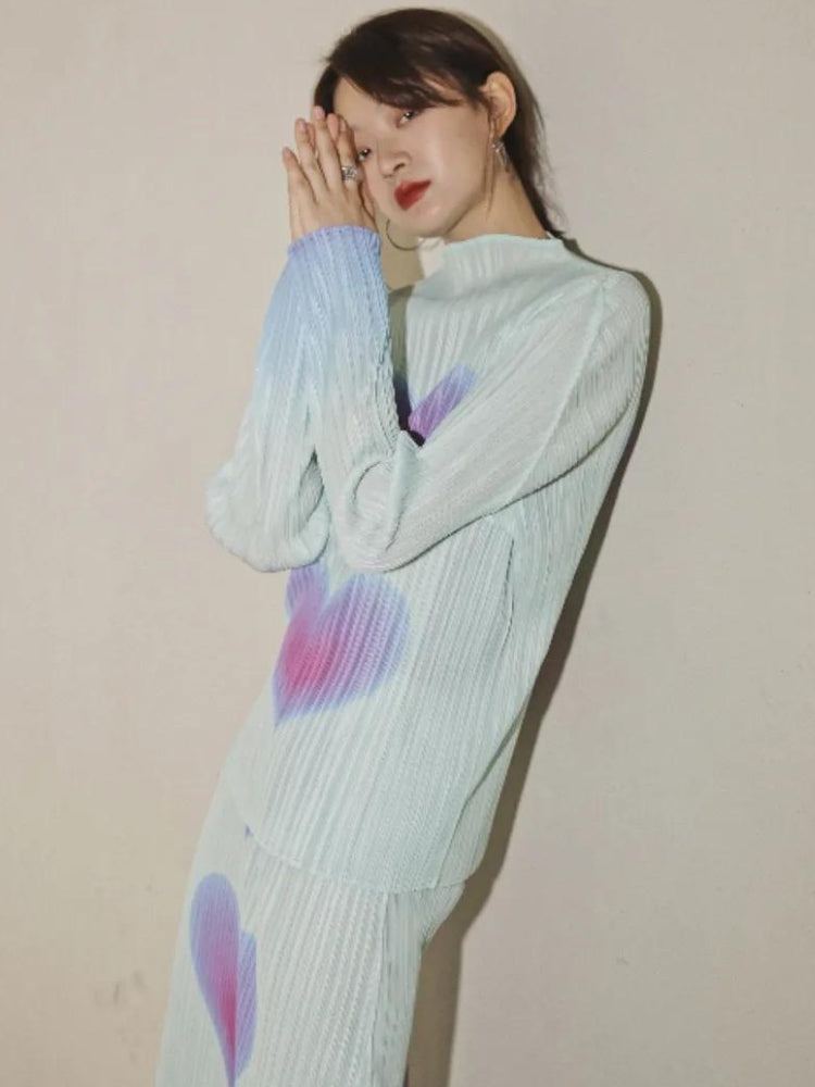 The soft pastel hues and heart motifs blend to create a whimsical and charming outfit that's perfect for spring days or casual outings. The ribbed texture and fluid pleats provide a tactile delight, ensuring you look as good as you feel. This set is a surefire way to inject some personality into your wardrobe, ideal for those who love to express themselves through stylish clothing.