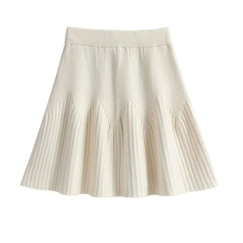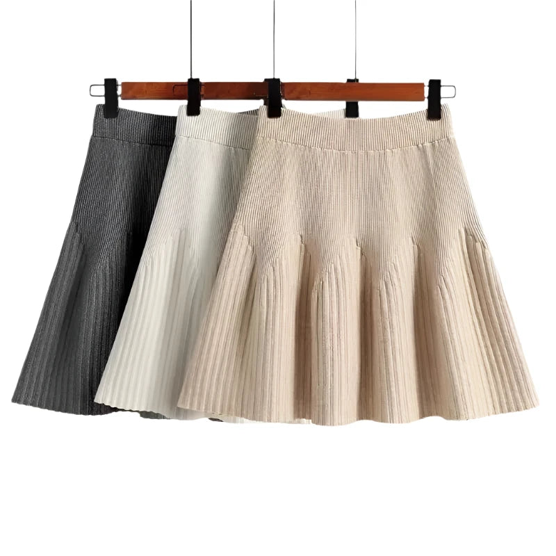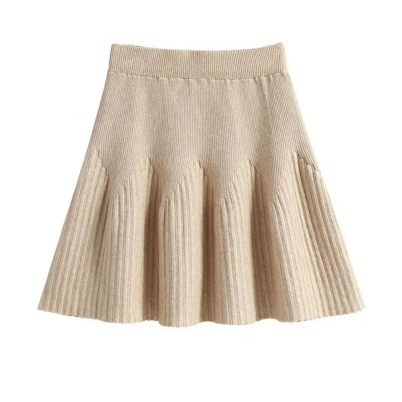 Brownm Solid A-line Knitted Pleated Mini Skirt