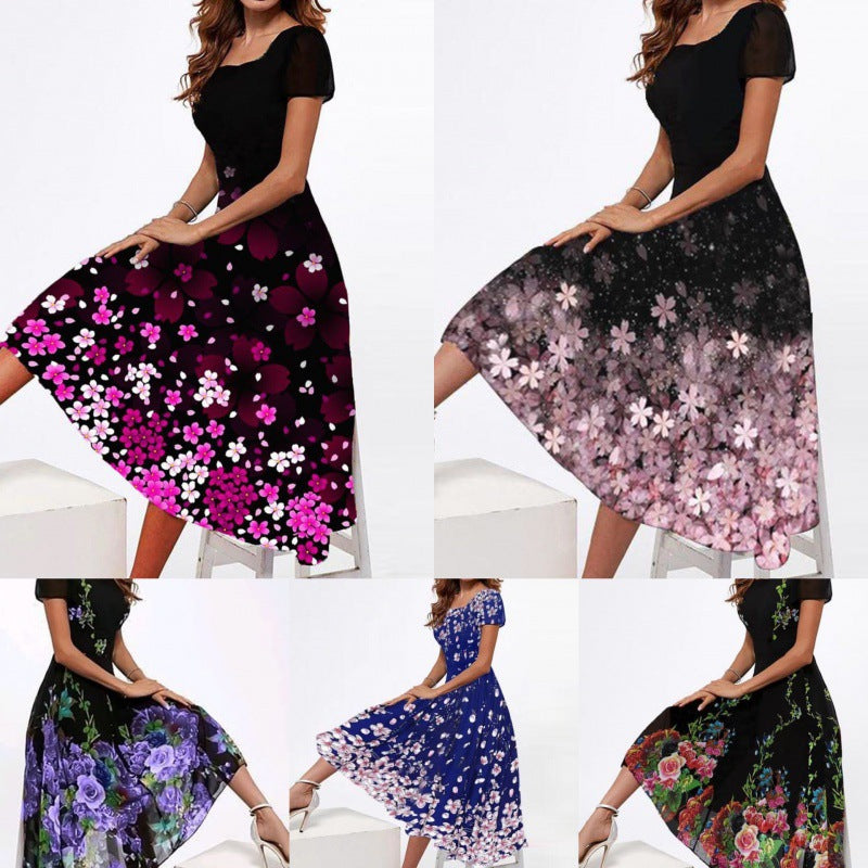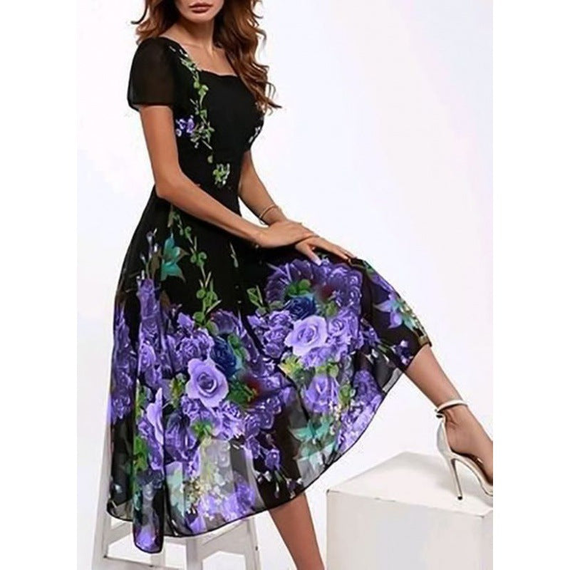 Women's Square Temperament Commute Collar Short Sleeve Multi-color Printing Dress