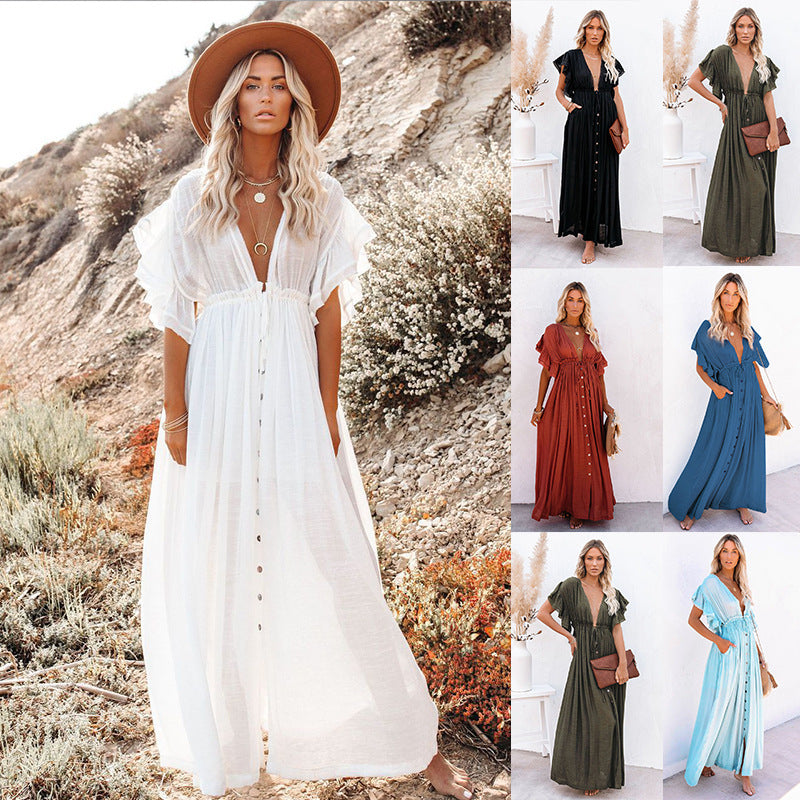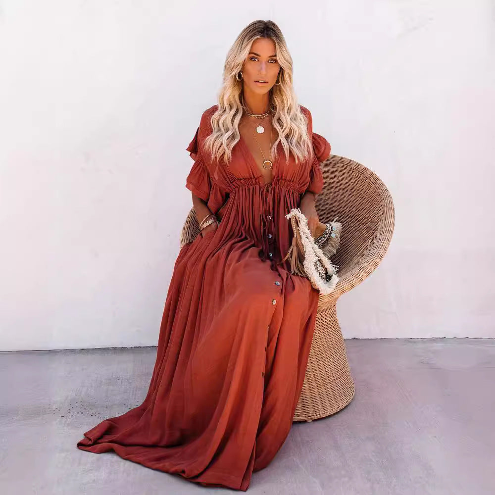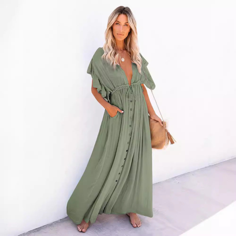 Brownm Summer Sun Protective Double-breasted Drawstring Dress Dresses