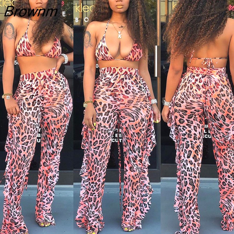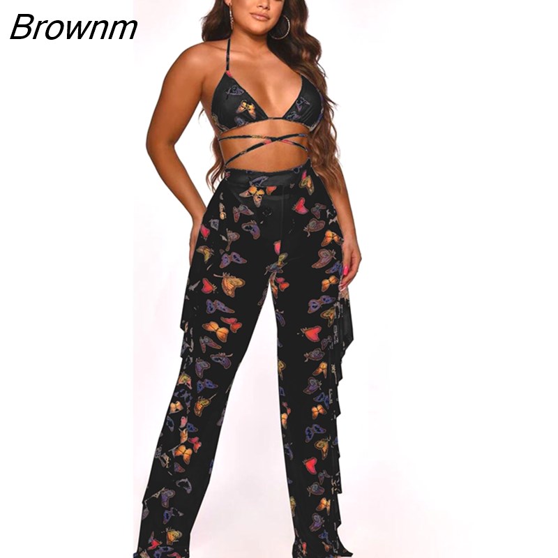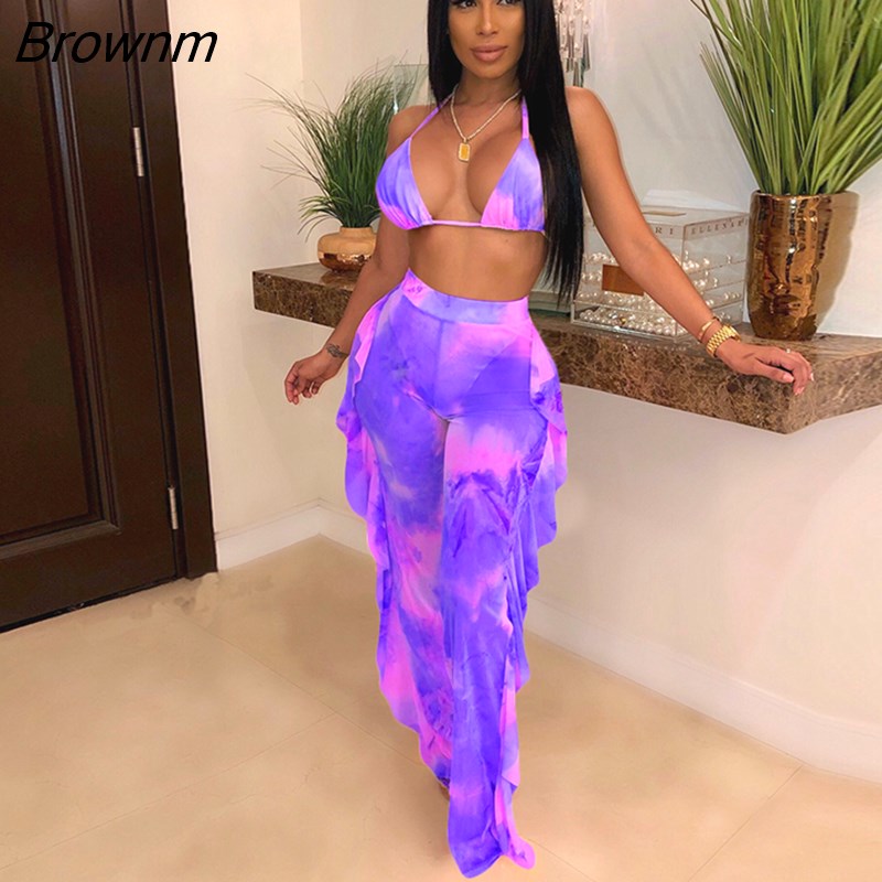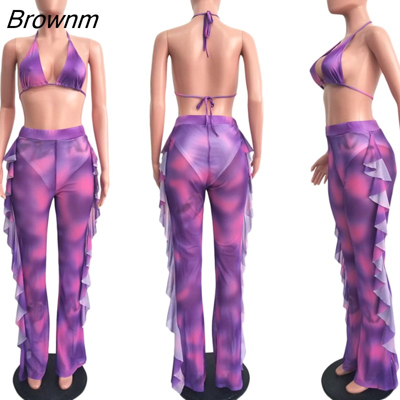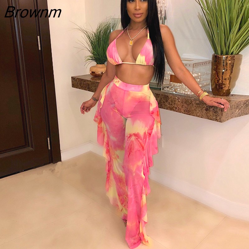 Brownm Tie Dye Print Mesh Summer Beach Two Piece Set with Panties Women Sexy Bra Halter Crop Top Ruffle Wide Leg Pants Suit