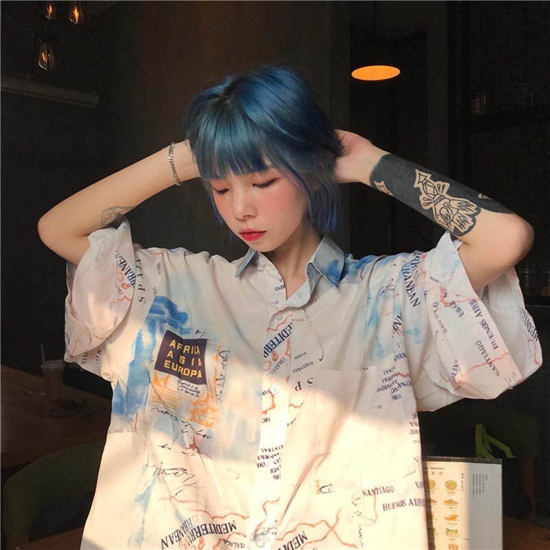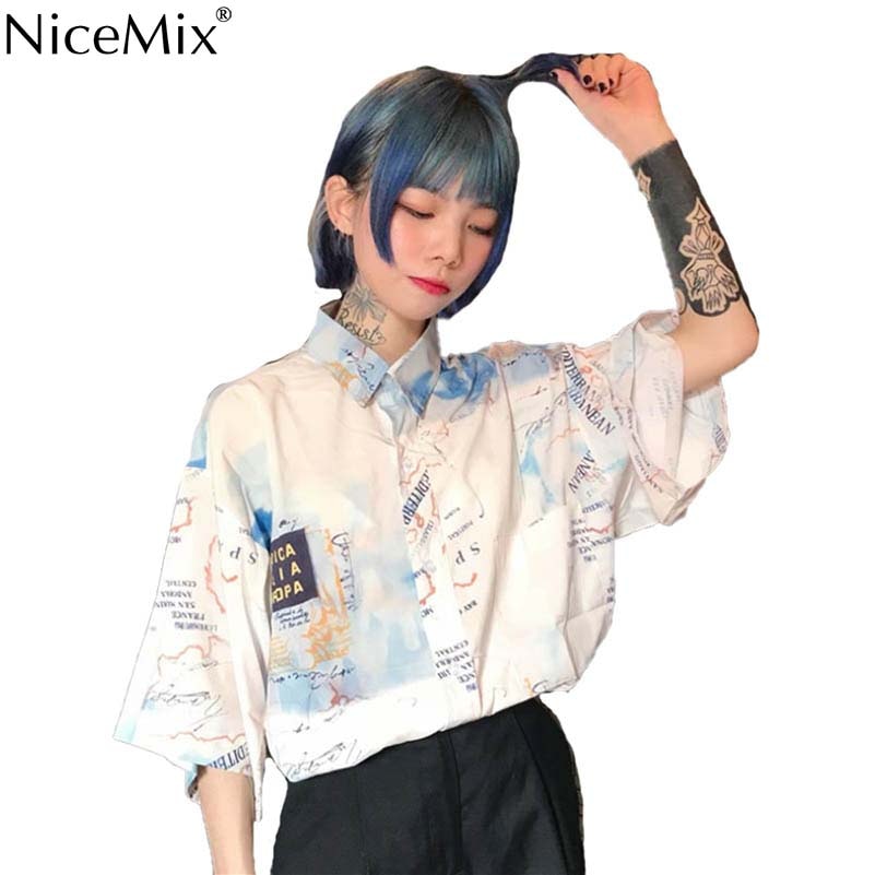 Button Up Shirt Women Summer Harajuku Blouse Short Sleeve Shirt Digtal Print Map Tops Blouses Casual Blusas Camisas Mujer 2021