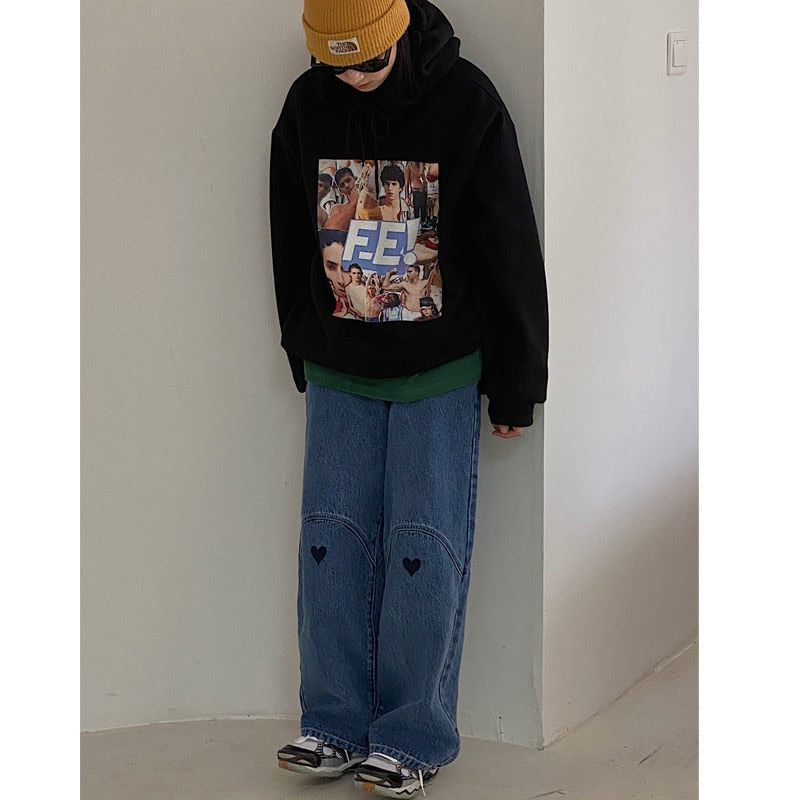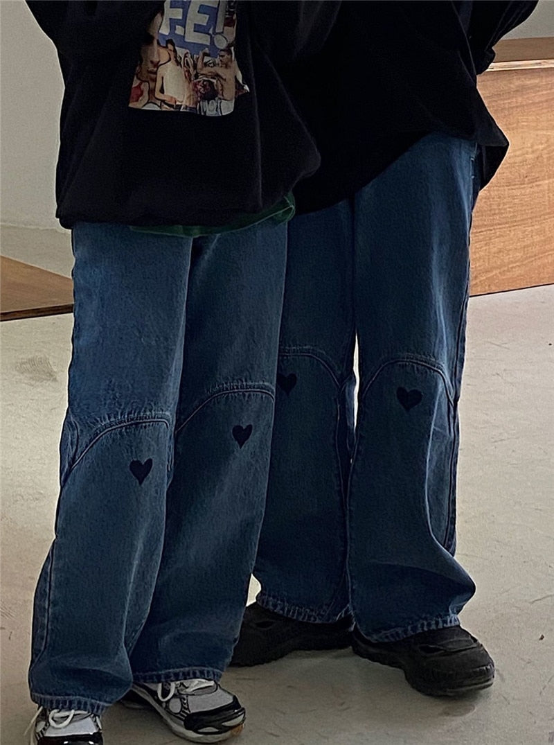 Casual Summer Blue Denim Jeans Women Korean Loose Love Pattern Baggy Jeans Feminino Wide Leg Pants Pantalon Pour Femme