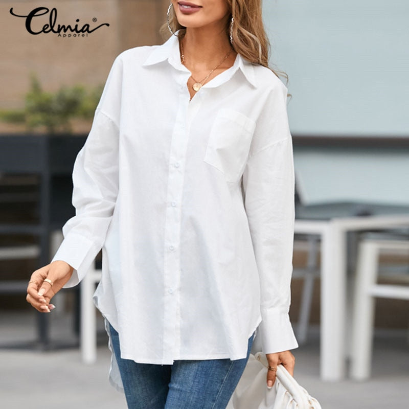 Celmia 2022 Women White Shirts Fashion Asymmetrical Tunic Tops Summer Lapel Solid Long Sleeve Button Casual Party Elegant Blusas