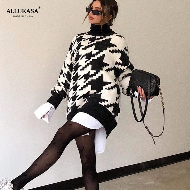 cuello suelto vestido Casual de mujer de punto Jersey largo de gran manga larga Invierno pata de gallo Jer 2020 top