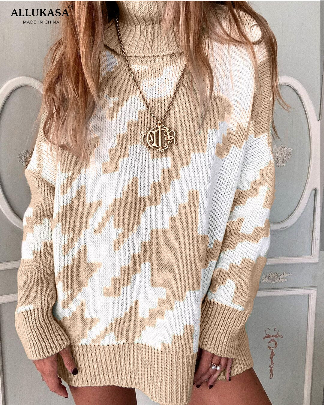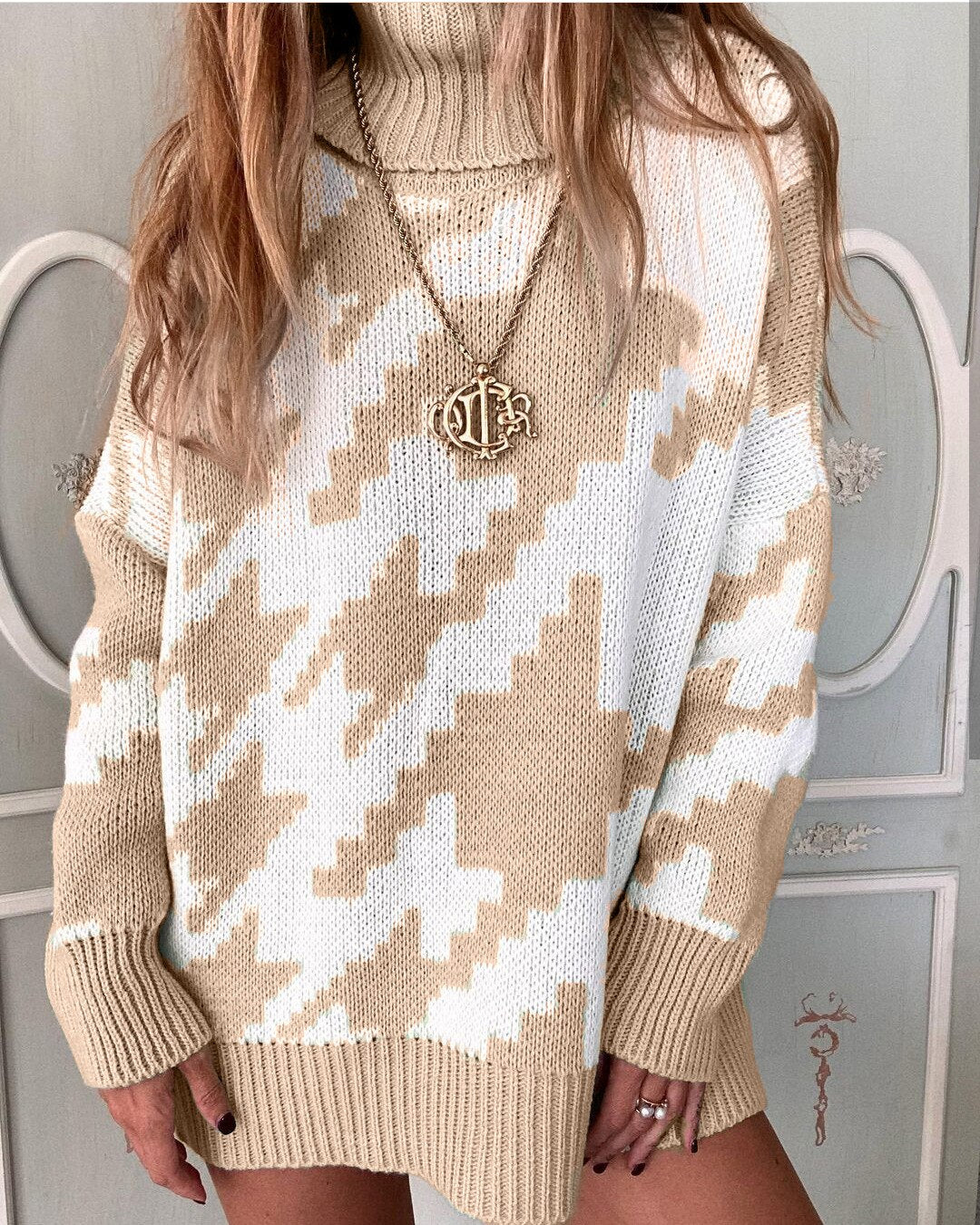 cuello suelto vestido Casual de mujer de punto Jersey largo de gran manga larga  Invierno pata de gallo Jer 2020 top