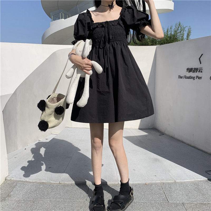 Dress Women Black Fairy Puff Sleeve Sweet Mini Vintage Party Lovely Female Simple Japanese Style Popular Summer Square Collar
