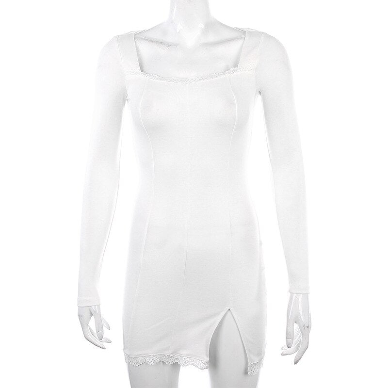 Dress Women Women Winter 2020 New Arrivals Sexy Long Sleeve Square Neck Lace Split Black White Solid Party Dresses Vestidos