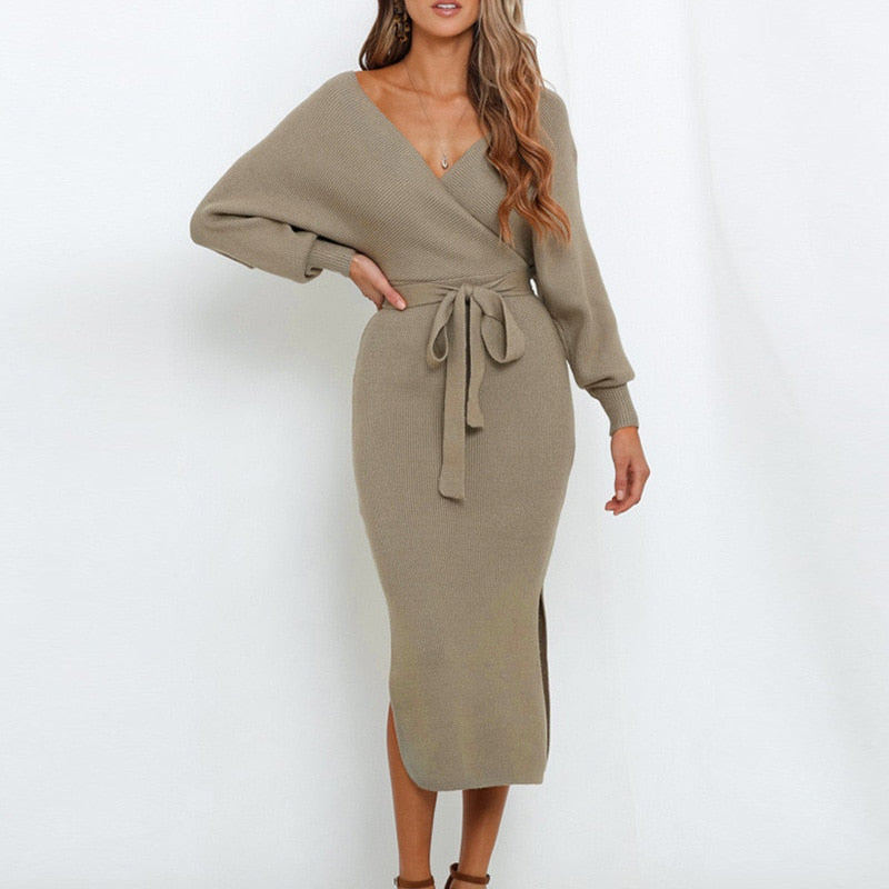 Elegant V Neck Lace Patchwork Ladies Dresses Autumn Long Sleeve Solid Ribbed Dresses Casual Loose Belted Sequins Dress Vestidos