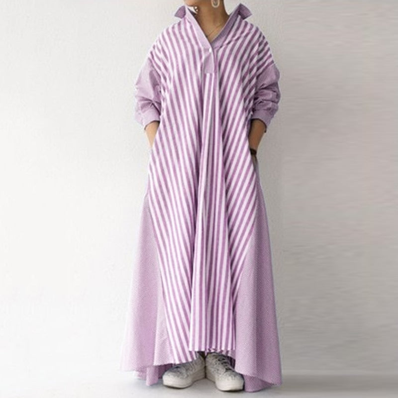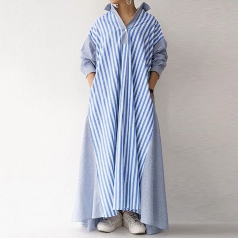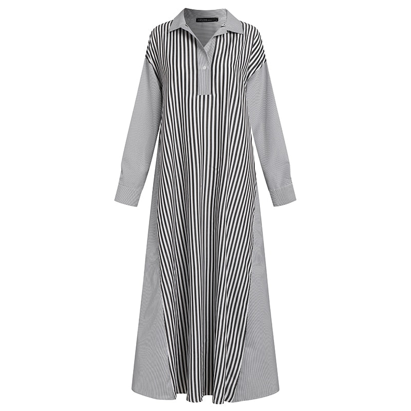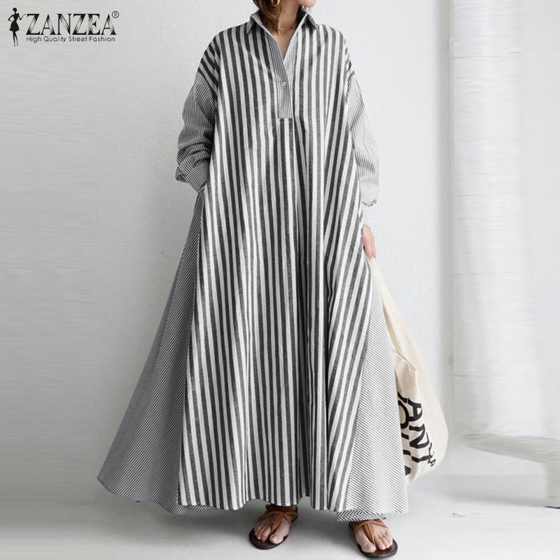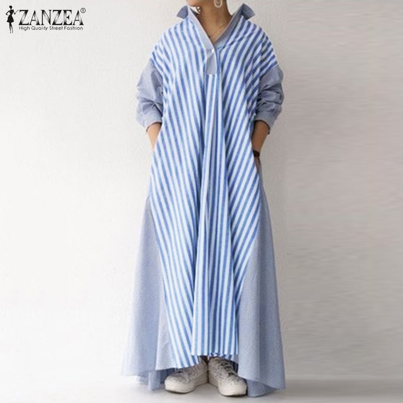 Fashion Maxi Dress ZANZEA Women Striped Patchwork Sundress Casual Autumn Long Sleeve Lapel Neck Long Shirt Vestidos Kaftan Robe