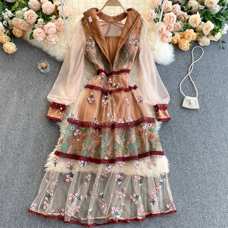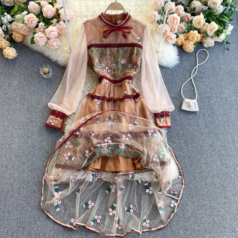 Fitaylor New Spring Autumn Women Elegant Lace Embroidery Patchwork Dress Vintage Ladies Stand Collar Floral Print Long Dress
