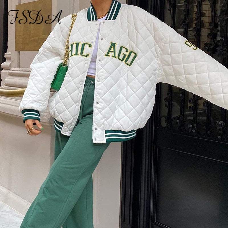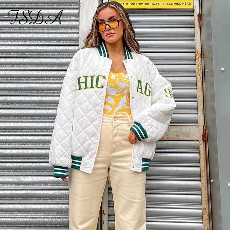 FSDA 2021 Autumn Winter Patchwork Jacket Varsity Women Casual Oversized Green Print Fashion Baseball Bomber Coat
