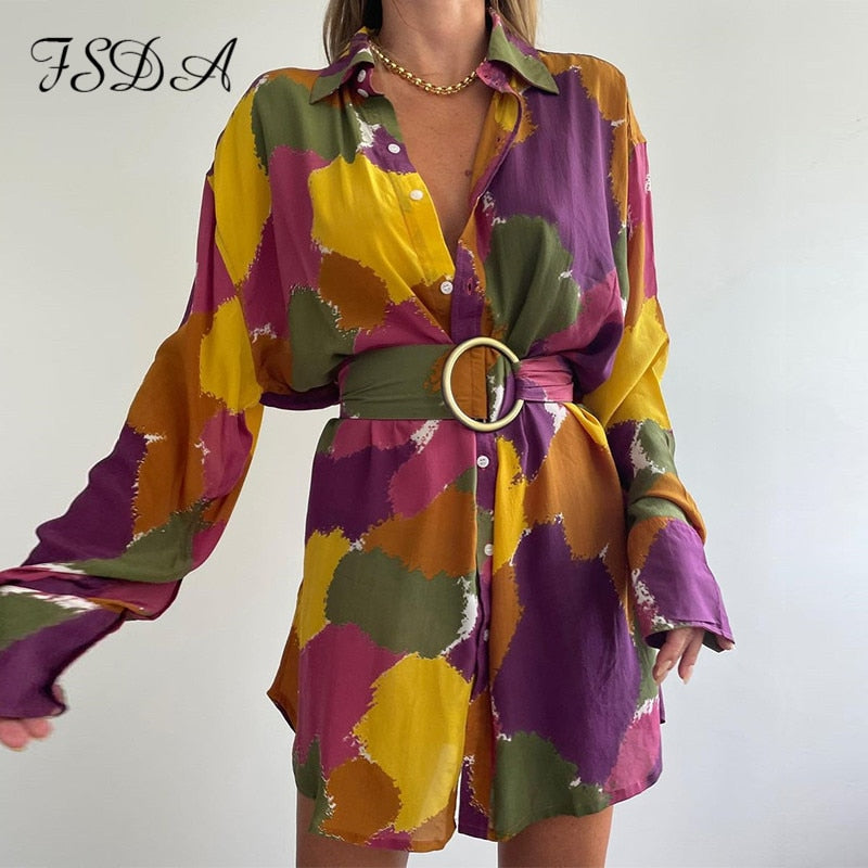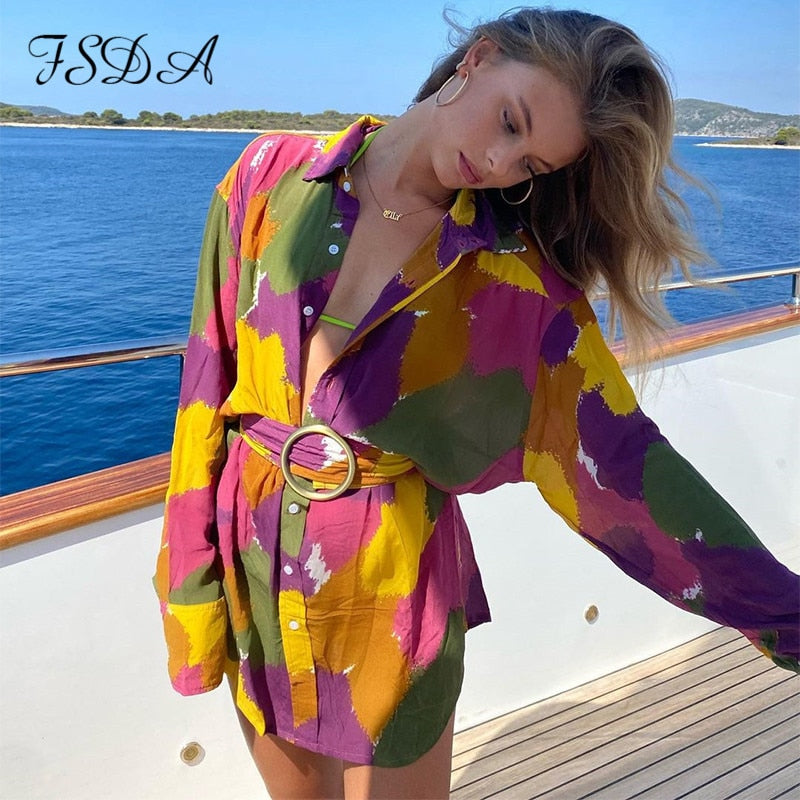 FSDA 2021 Floral Print Long Sleeve Dress Women A Line With Belt Beach Summer Spring Sexy V Neck Casual Mini Dresses Holiday