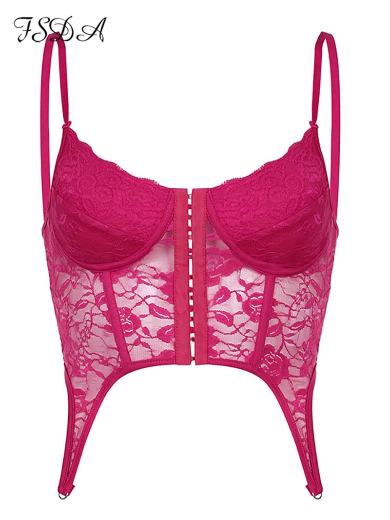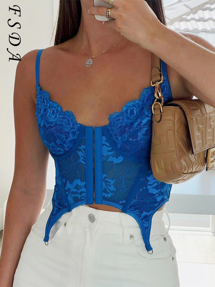 FSDA 2021 Spaghetti Strap Lace Corset Crop Top Women Blue Y2K Summer Backless Sleeveless Tube Tank Tops Sexy Off Shoulder
