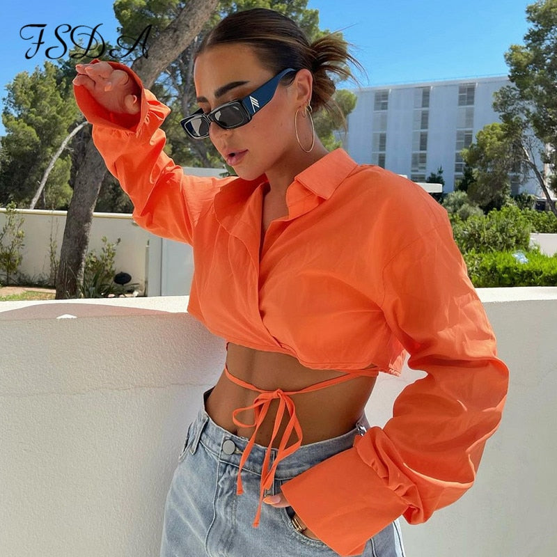FSDA 2021 V Neck Orange Crop T Shirts Bandage Sexy Women Long Sleeve Summer Autumn Fashion Casual Top Shirt