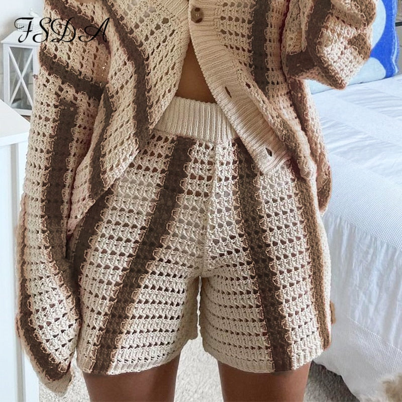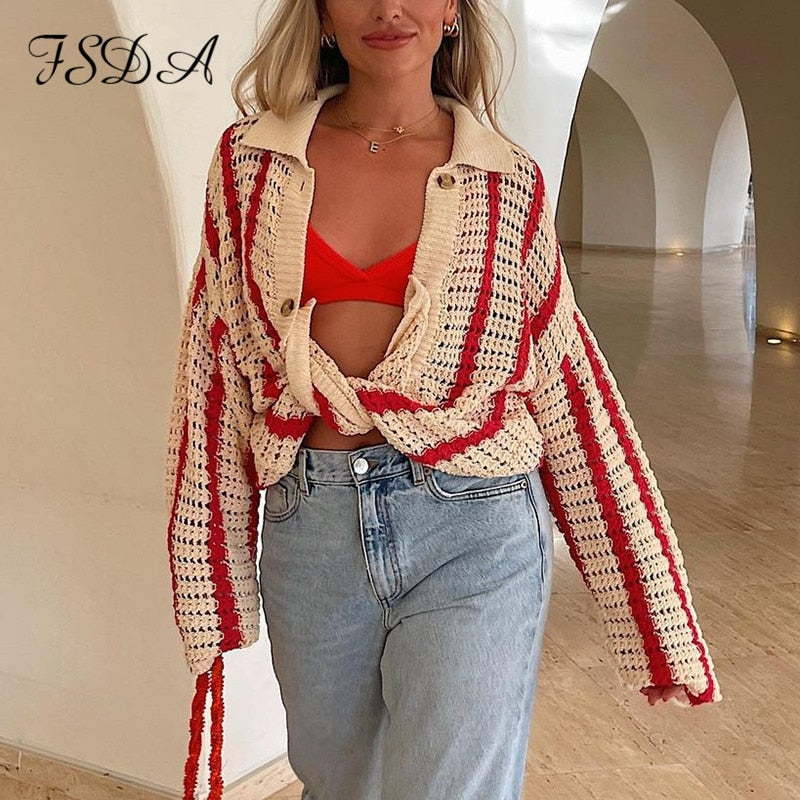 FSDA Knitted Long Sleeve Cardigan Women Red Stripe Loose Autumn Winter Fashion Casual Sweater Top V Neck Oversized